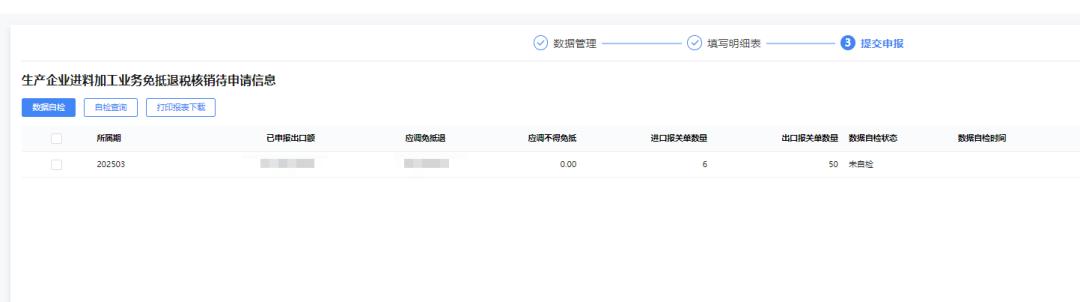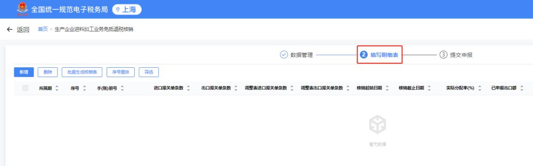 1点击“填写明细表”按钮,进入采集生产企业进料加工业务免抵退税核销表界面。