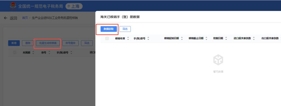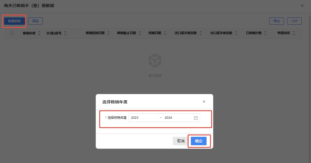 2点击“批量生成核销表”按钮,弹出海关已核销手(账)册数据页面,点击“数据获取”按钮,弹出弹窗选择核销年度,点击“确认”按钮,获取对应年度的加贸数据。