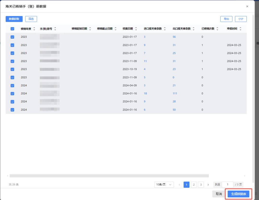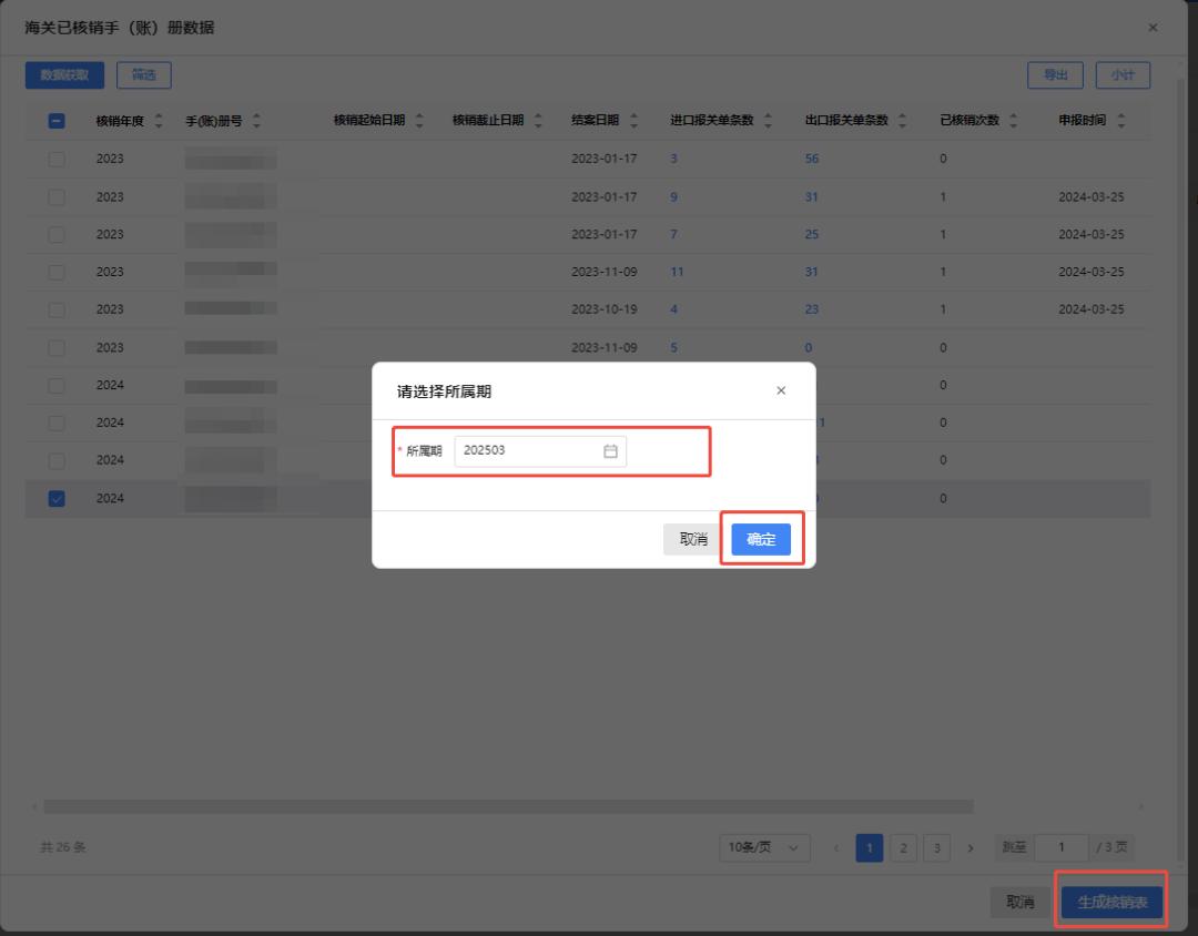 3勾选需要核销的手账册,点击“生成核销表”,选择需要核销的“所属期”。点击“确定”按钮,提示生成到采集明细表中。