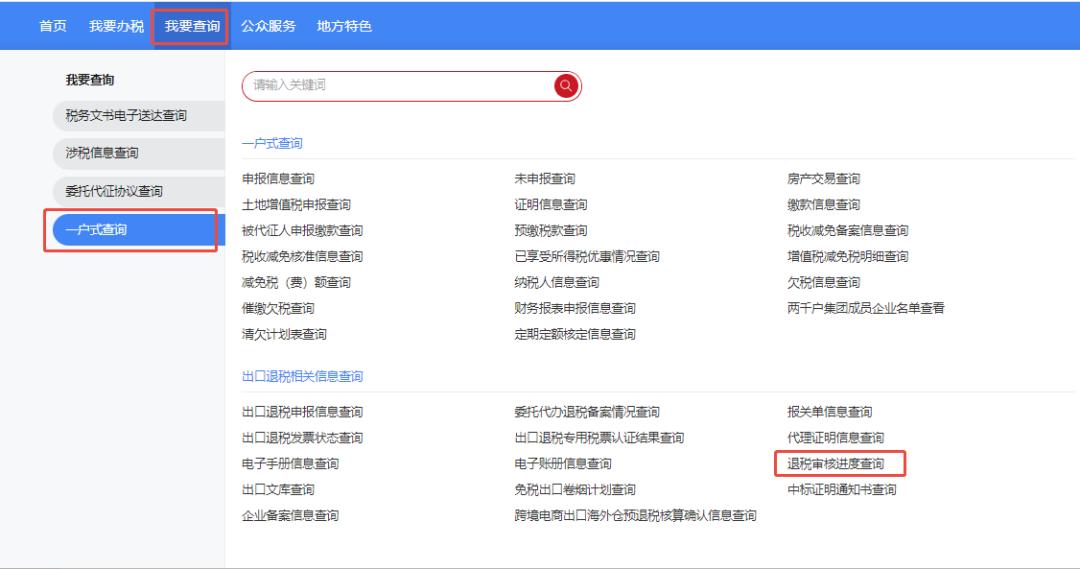 (1)登录新电子税局后,点击【我要查询】-【一户式查询】-【出口退税相关信息查询】-【退税审核进度查询】功能菜单。