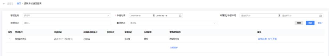 (2)进入查询模块后可通过输入“事项名称”、“申请时间”、“所属期”、“申报批次”、“事项状态”筛选项进行筛选查询。