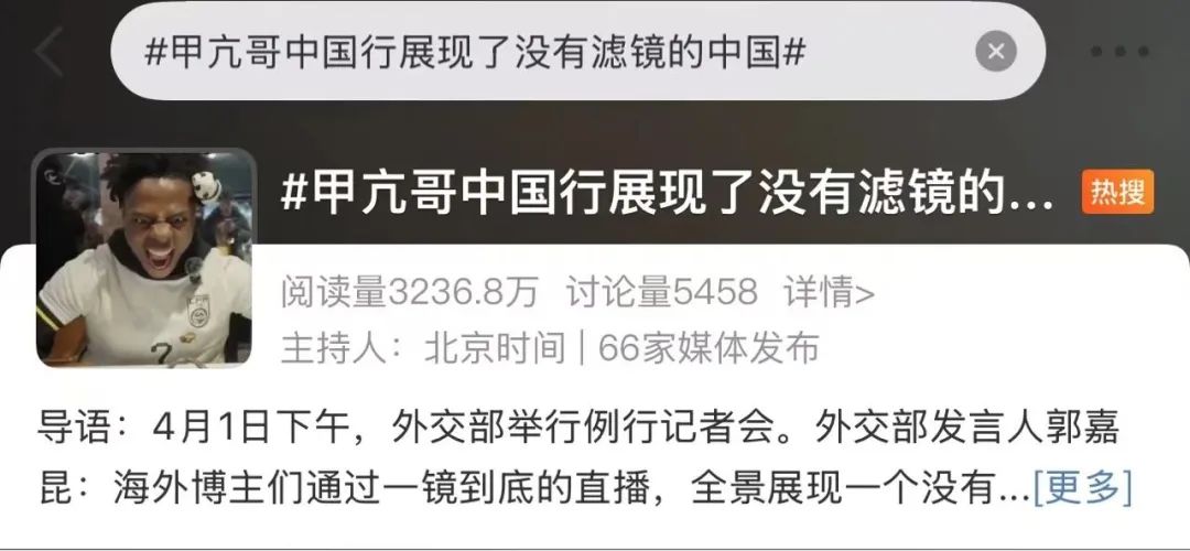 对于“甲亢哥”中国行,一位美国博主说:“美国政府过去一年刚花了16亿美元抹黑中国,结果被一些个人网红在影响力上碾压了。他们只要亲自去中国走走,直播起来,就让美国政府天价宣传打水漂了。”