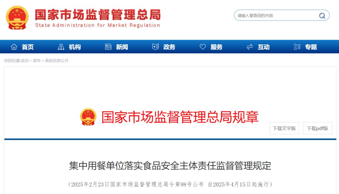 学校、托幼机构、养老机构、医院、机关食堂等集中用餐单位食品安全是餐饮服务食品安全的重中之重,为督促集中用餐单位、单位食堂、承包经营企业、供餐单位落实食品安全主体责任,健全食品安全责任制,提高风险防控能力,维护群众饮食安全,市场监管总局将集中用餐单位落实食品安全主体责任的规定单独立法,制定出台《规定》。