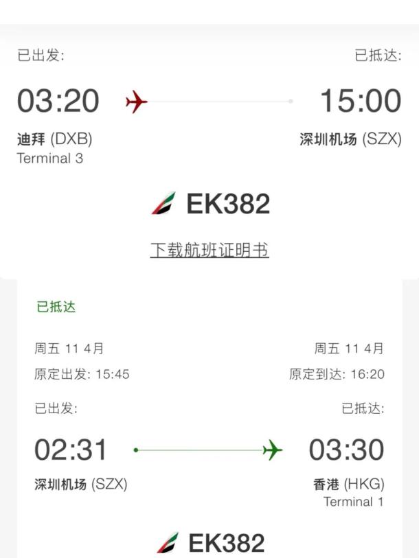 记者从阿联酋航空官网获悉,4月11日,该趟航班已经抵达香港。