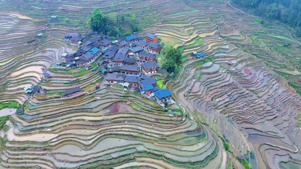 贵州从江县加榜梯田是罕见的田中有村寨的梯田。 澎湃新闻记者 陈鑫露 图