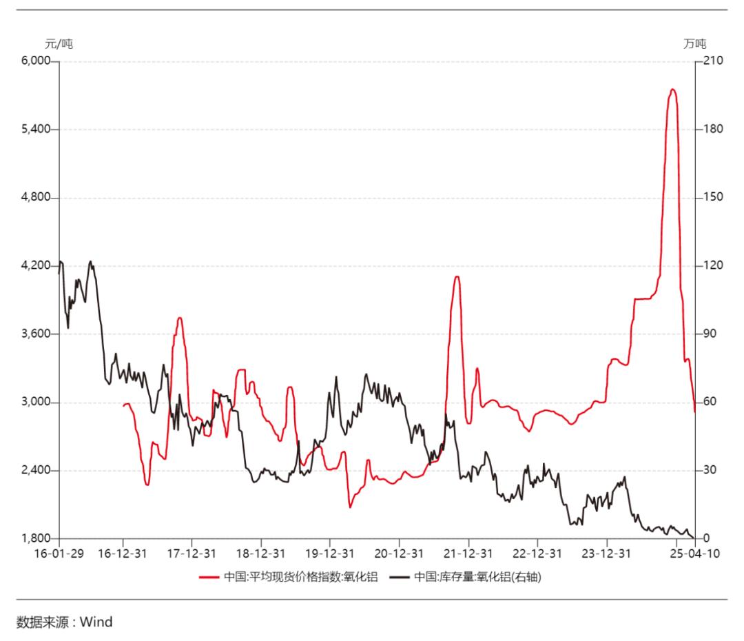记者留意到,在氧化铝价格从一个极端走向另一个极端甚至被腰斩的四个月时间内,我国氧化铝的库存量(该指标每周四下午更新当周数据,统计的是鲅鱼圈港、连云港、青岛港的氧化铝合计值,下同)并未出现急剧放大,反而却是不断减少。Wind数据显示,2024年12月5日当周,氧化铝的库存量为5.90万吨。其后这一数据虽然略有反复,但总体上保持下降趋势,至2025年4月3日当周,下降至0.40万吨。直到4月10日当周,才出现累库迹象,上涨至0.50万吨。