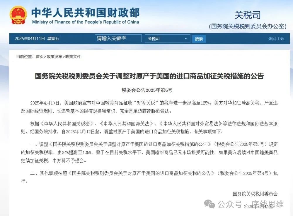 国务院关税税则委员会4月11日发布公告,自4月12日起,调整《国务院关税税则委员会关于调整对原产于美国的进口商品加征关税措施的公告》(税委会公告2025年第5号)规定的加征关税税率,由84%提高至125%。刘扬声:我觉得中国的反制是有系统、有策略的,是做了完全的分析后才提出的,不像特朗普“一棒子全球打”。比如说,我们从美国买的这些东西,对特朗普最重要的一个是能源,一个是农产品。这两个都涉及特朗普选票的池子。