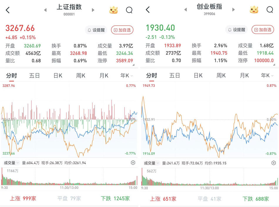 至收盘,上证综指涨0.15%,报3267.66点;科创50指数跌0.78%,报1006.34点;深证成指跌0.27%,报9858.1点;创业板指跌0.13%,报1930.4点。