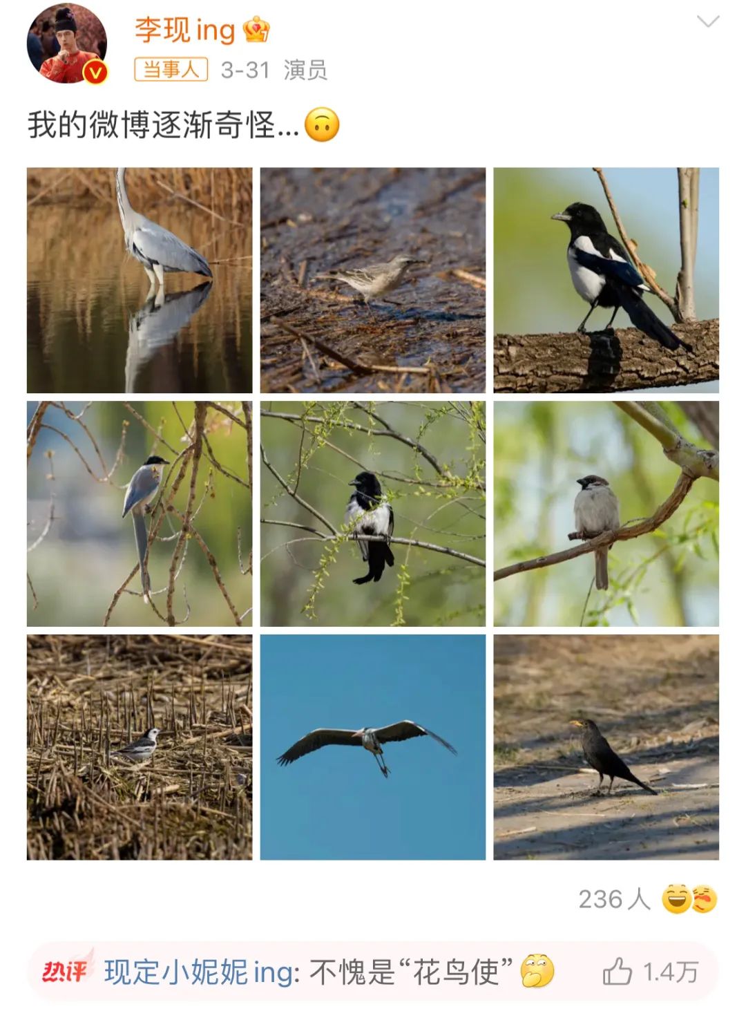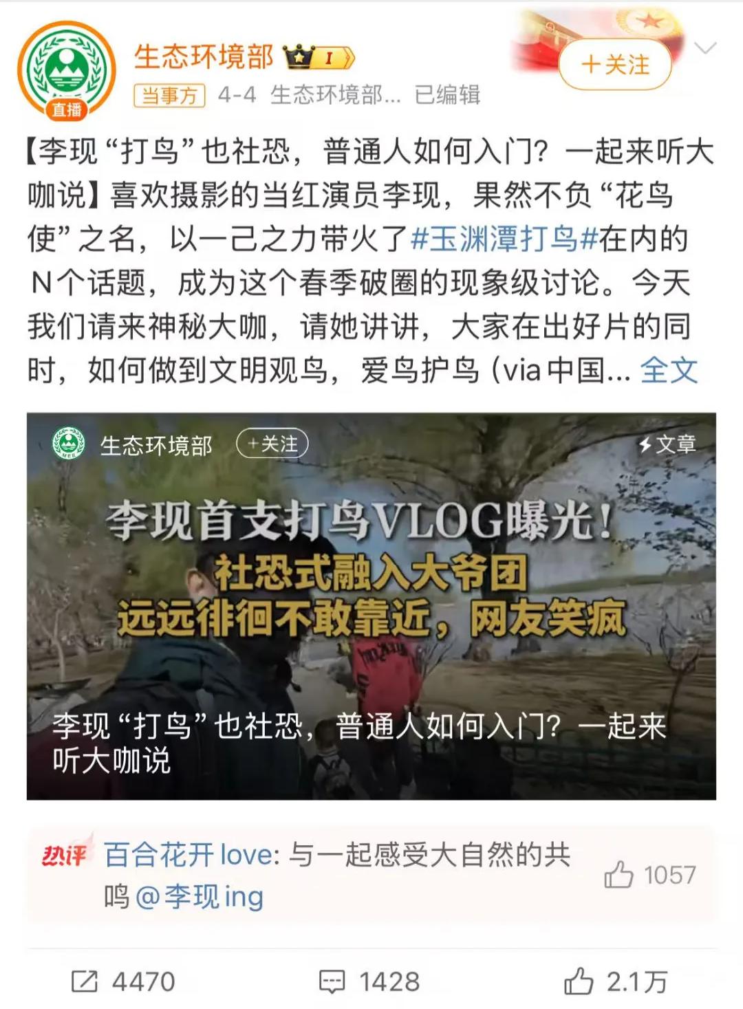演员李现因热爱观察和拍摄鸟类