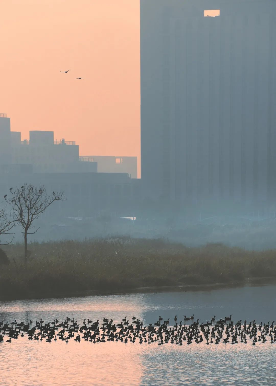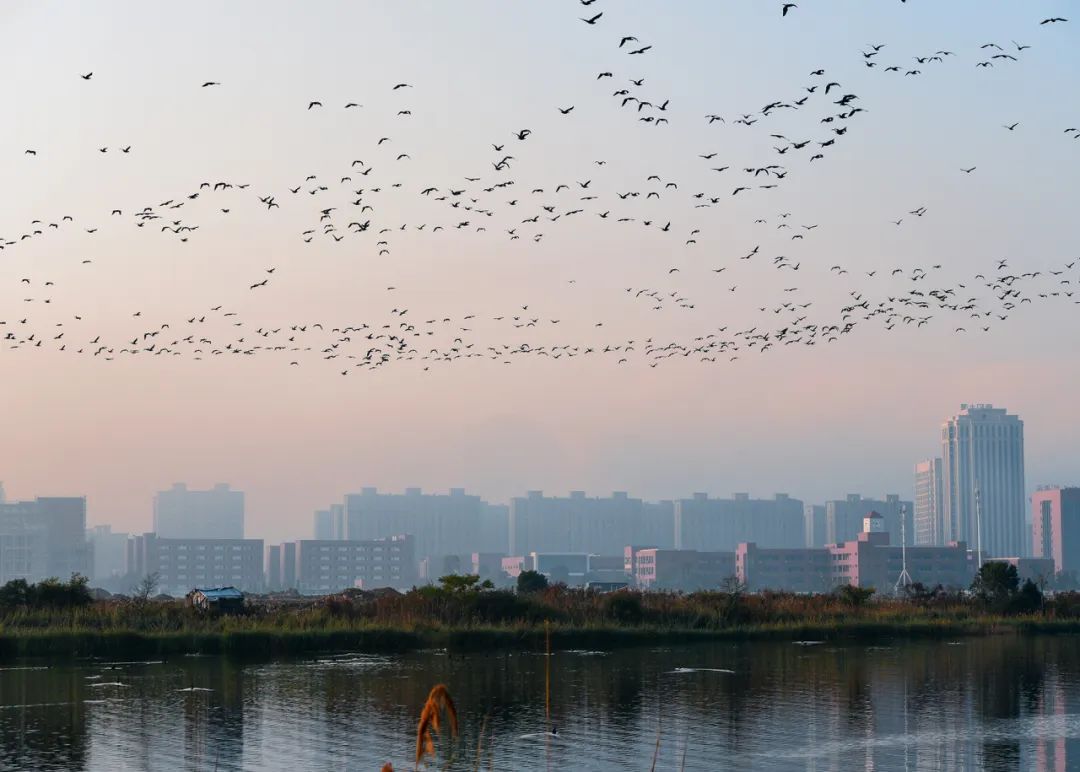 金鳞湖湖面东西向最长1800米,南北向最宽680米,其广阔的水域与周边生态湿地、绿地景观带,为候鸟提供了丰富的食物资源与安全的栖息环境,因此成为候鸟的重要栖息地。