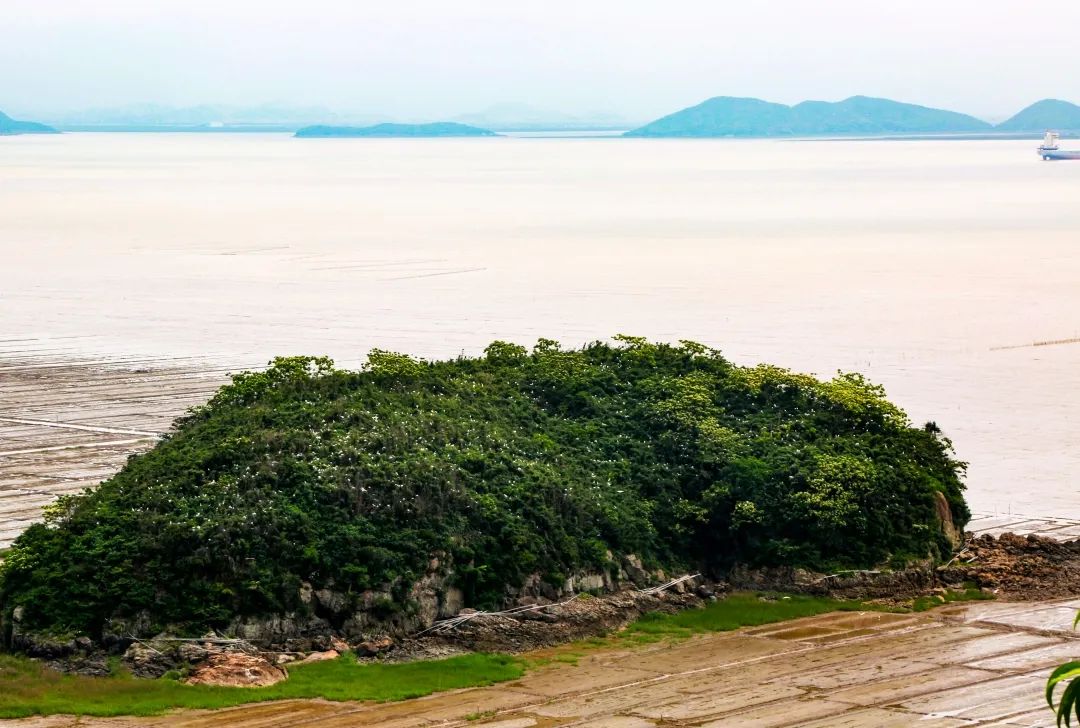 俯瞰蛇蟠岛,岛上两山一大一小,状如两条蟒蛇缠绕,故称为大蛇山、小蛇山。小蛇山是三门县鸟类重点栖息地保护区之一,山上栖息着无数白鹭,它们在这里筑巢繁殖。