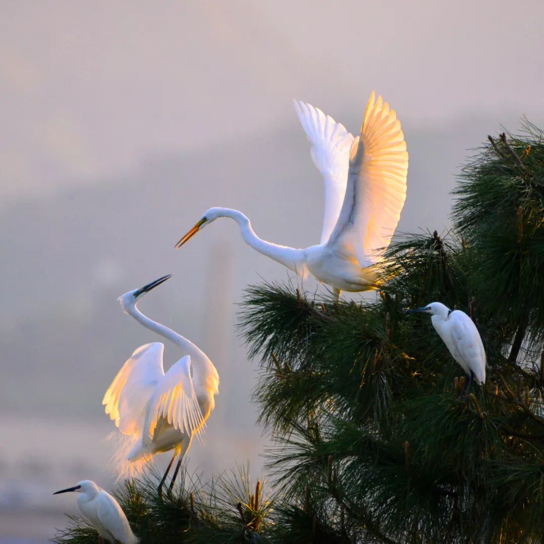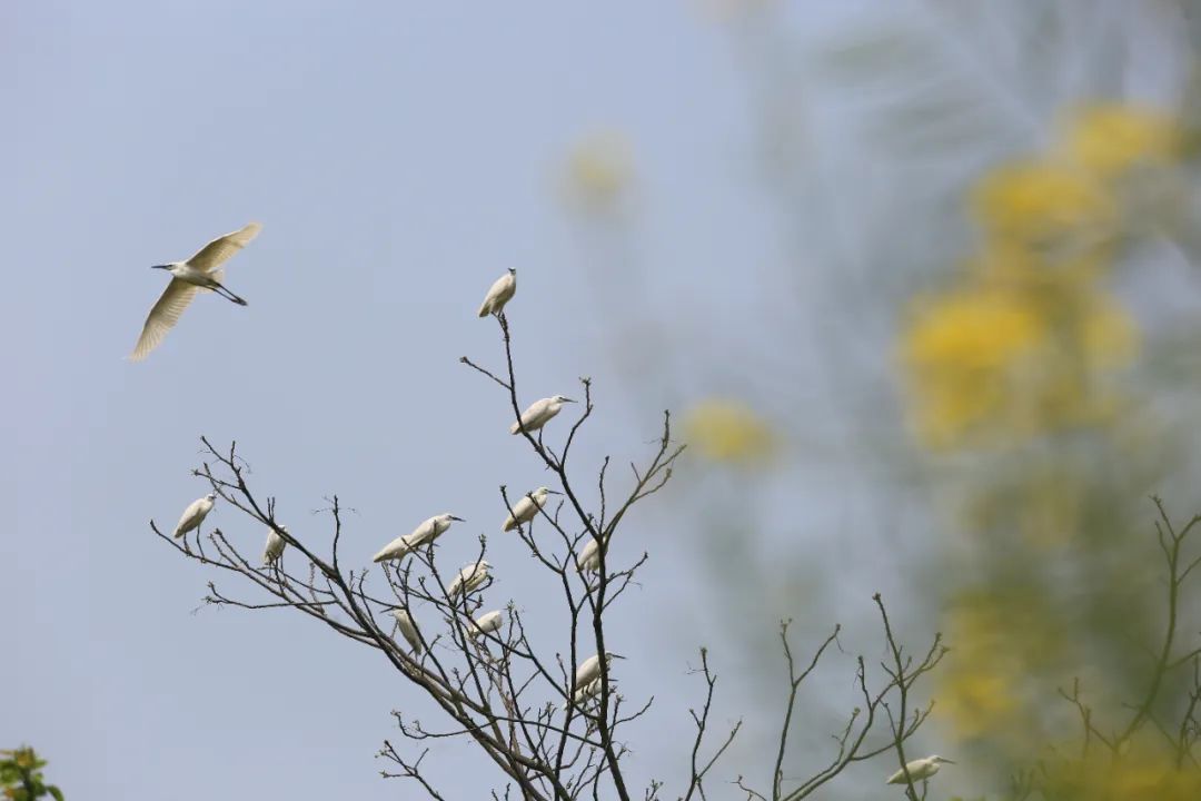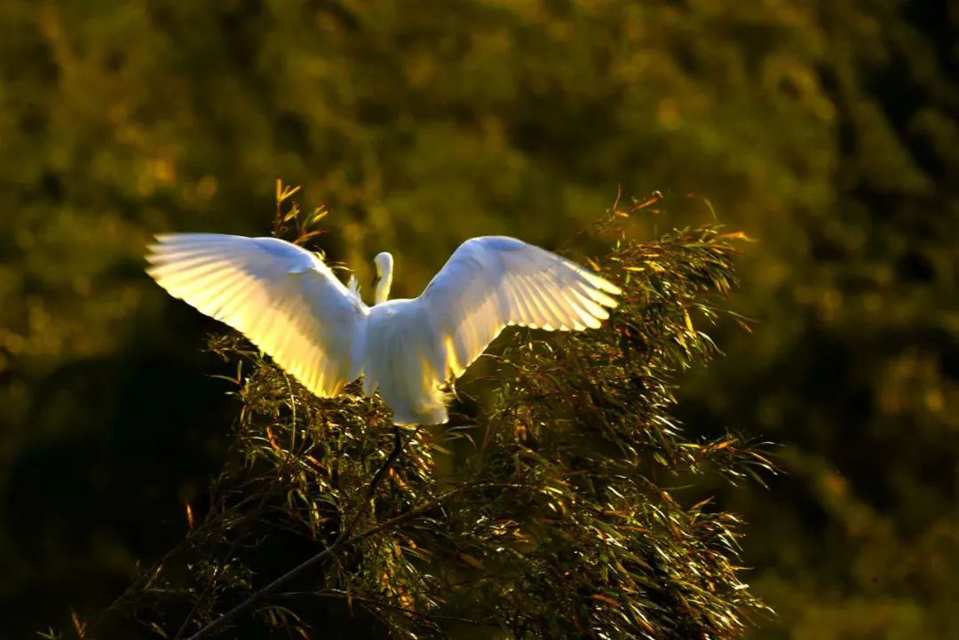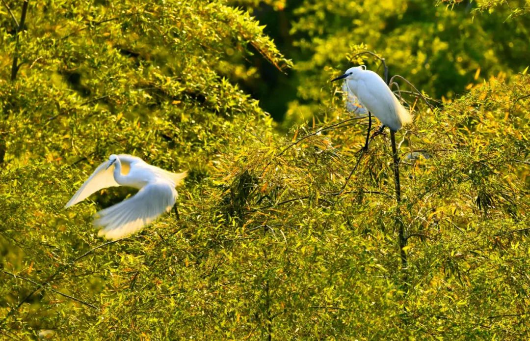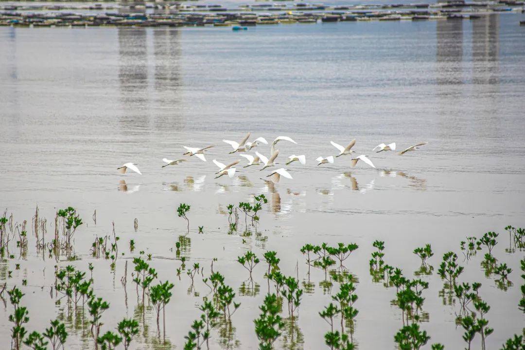 图|任秀玲白鹭群自由自在地在红树林间栖息、觅食,涨潮时,白鹭或立于枝头、或在林中跳跃、或低空飞翔,翩翩起舞。偶尔被游人惊起,百鸟飞翔的景象,蔚为壮观。