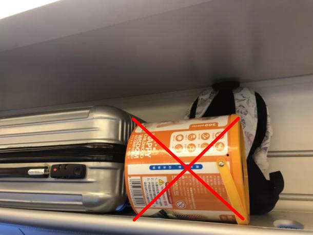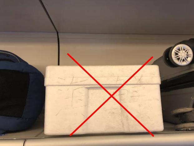 07装有生鲜食品的泡沫盒也不能放在行李架上,以免汁水滴落弄脏自己和他人的衣物。