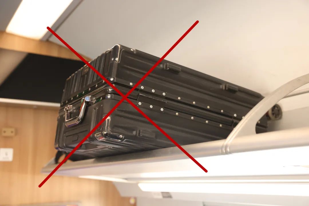 03行李箱摆放时不能超过行李架边缘,应选择顺行李架方向摆放。