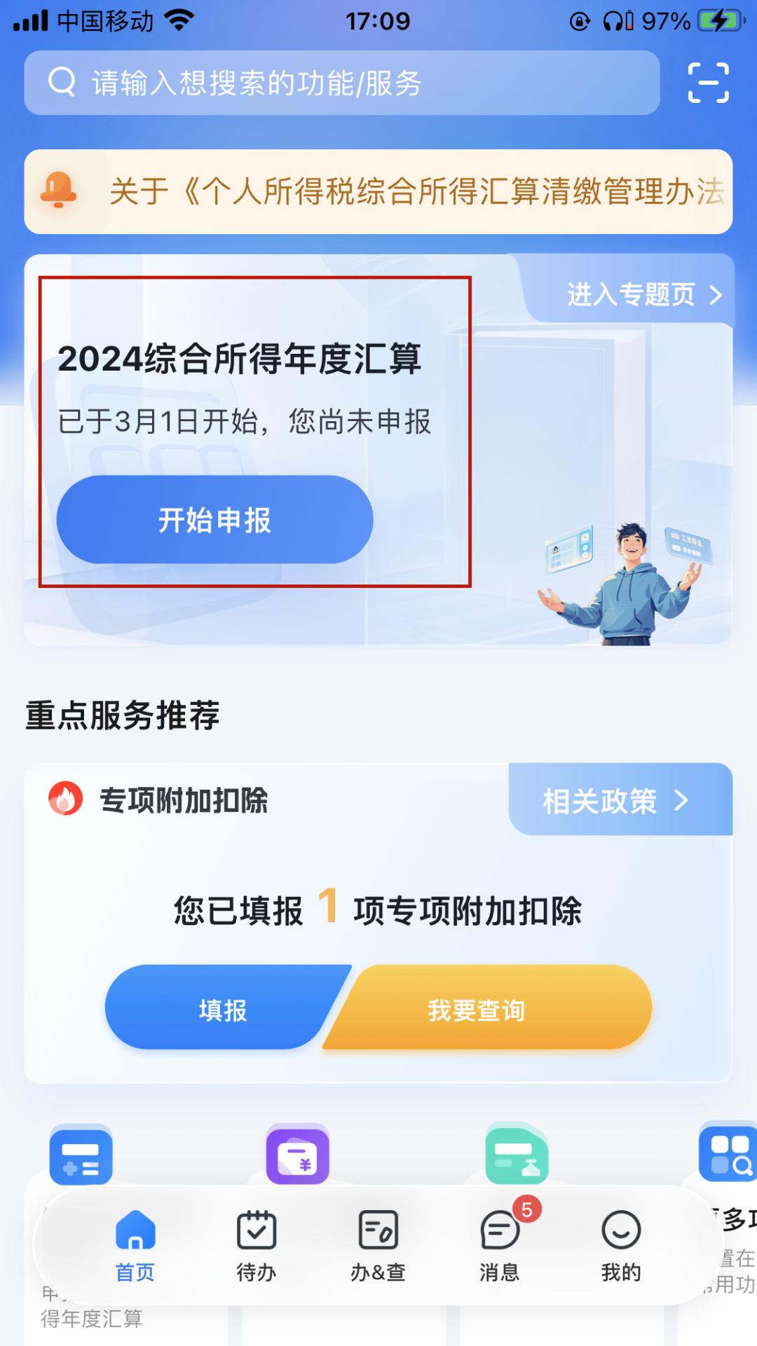 二、进入个人所得税APP首页,点击【2024综合所得年度汇算-开始申报】,在“标准申报”页面最下方找到“准予扣除的捐赠额”,点击进入。