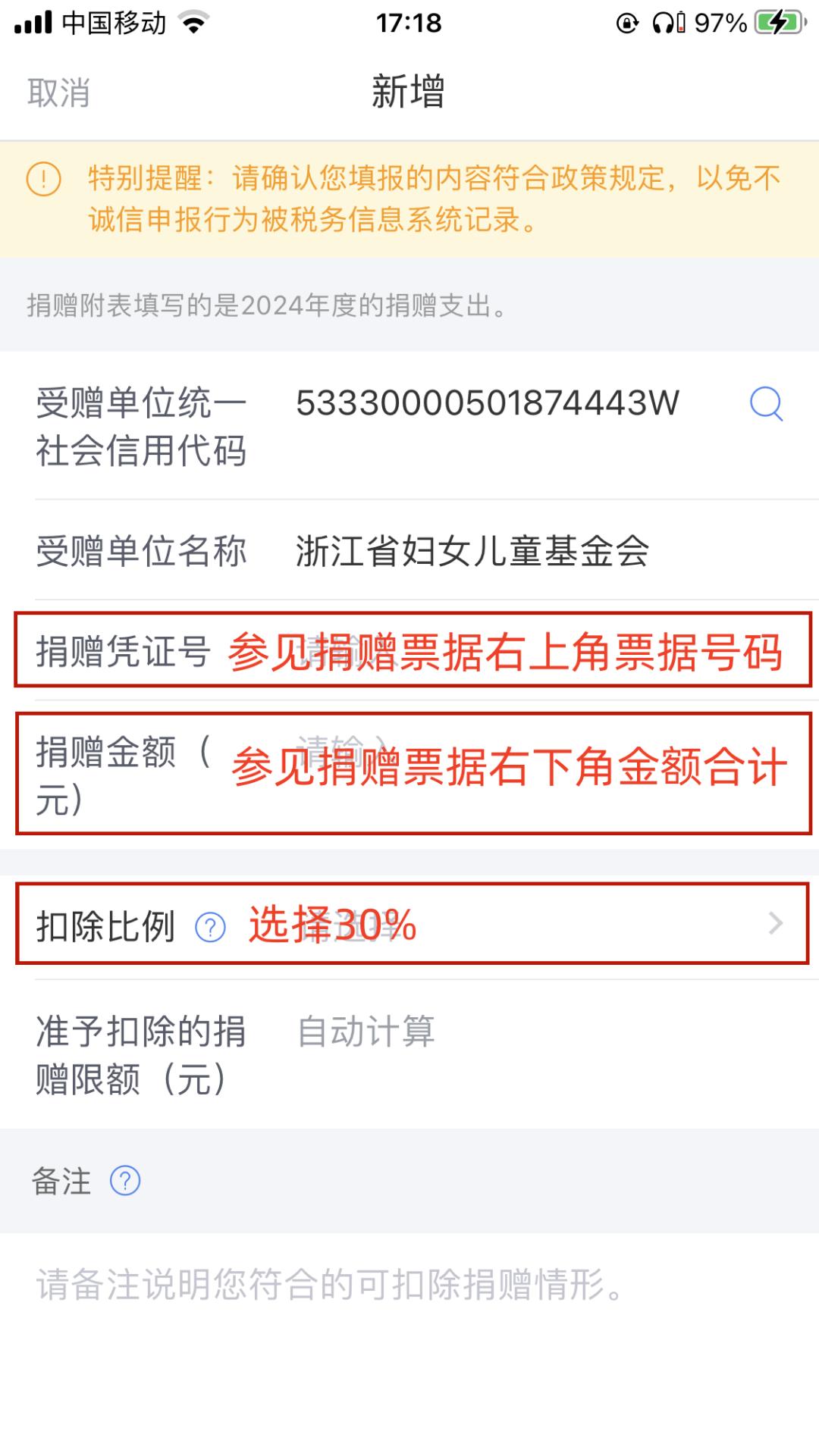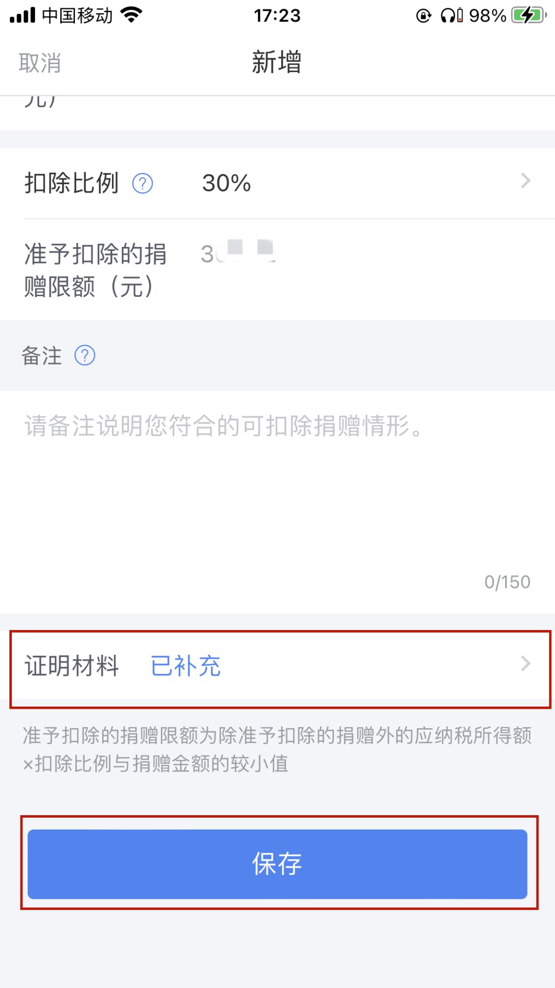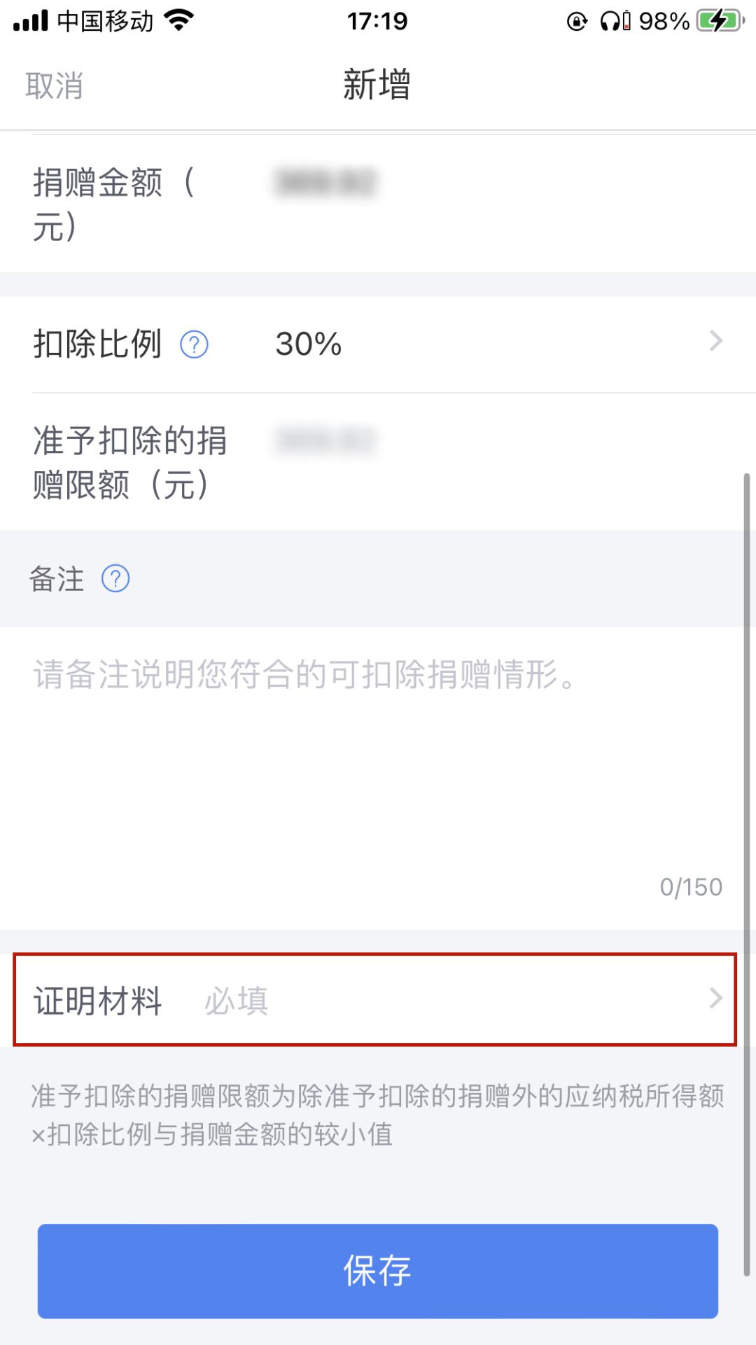 四、根据提示和已开具的捐赠票据,如实填写公益捐赠信息,并在证明材料处上传相关票据。填写后点击“保存”,系统将自动生成您的抵税扣除额,如需申报多项捐赠抵税,点击右上角“新增”继续申报。