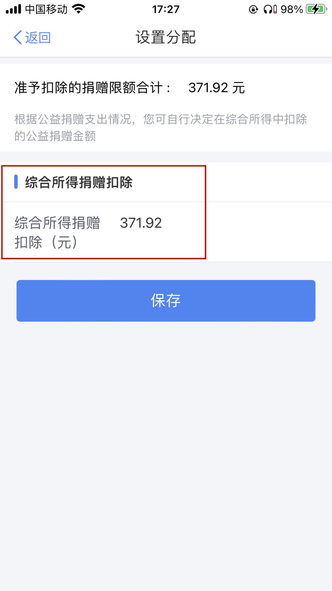 五、所有捐赠票据信息登记完毕后,回到原来页面选择“分配扣除”,根据准予扣除的捐赠限额合计数填写“综合所得捐赠扣除金额”,点击“保存”即可。公益事业捐赠税前扣除填列完毕,点击“返回”,可继续后续2024年度个人综合所得年度汇算清缴其它步骤。