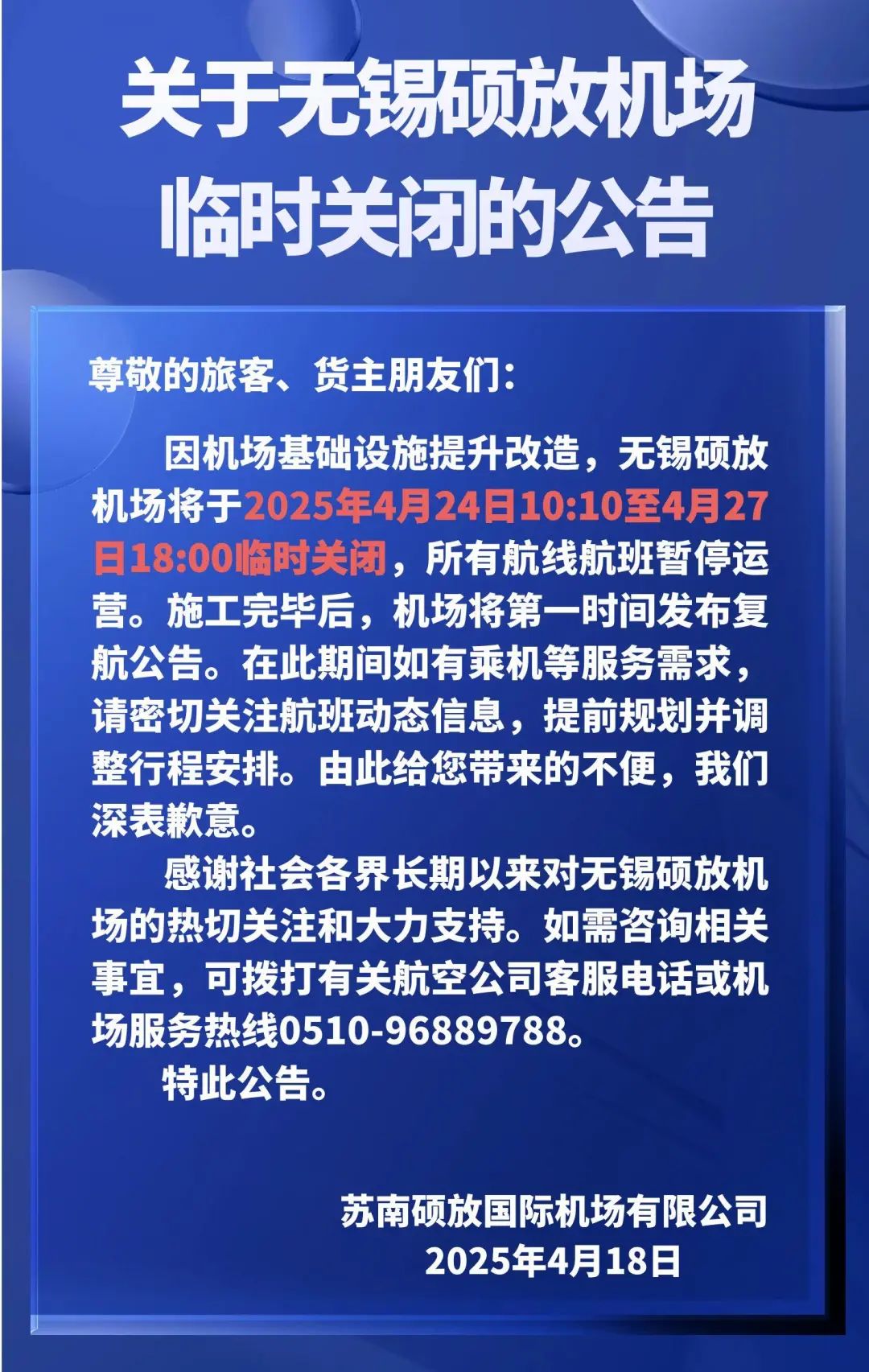 4月18日,无锡硕放机场发布公告称,因机场基础设施提升改造,无锡硕放机场将于2025年4月24日10:10至4月27日18:00临时关闭,所有航线航班暂停运营。施工完毕后,机场将第一时间发布复航公告。在此期间如有乘机等服务需求,请密切关注航班动态信息,提前规划并调整行程安排。