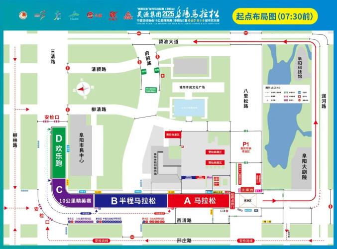 参赛人员自带大巴(跑团大巴)集中前往比赛起点的,请由颍州路一三清路一穿越颖淮大道与三清路交口,停放在三清路与清颍路交口附近指定区域。