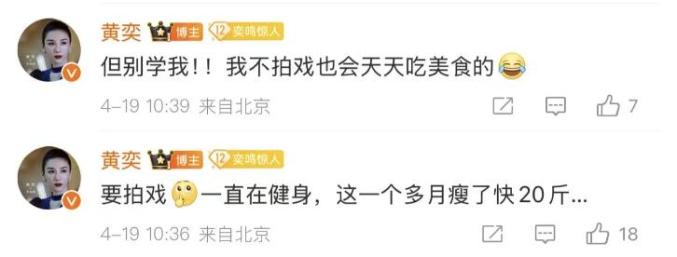 评论区有粉丝问“姐姐怎么瘦了这么多啊!”黄奕回复:“要拍戏一直在健身,这一个多月瘦了快20斤……”不过随后她又补充;“但别学我!!我不拍戏也会天天吃美食的