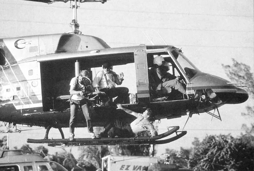 这个想法最终促成了一些最惊险的镜头:特技演员真实悬挂在迈阿密街道上空355英尺的高度。