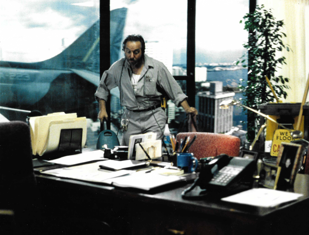 当哈里尔战机即将撞入大楼时,楼内一位戴着耳机、悠然自得的清洁工正在专注地擦地,对身后窗外发生的事情浑然不觉。