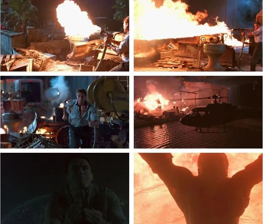 △哈利(施瓦辛格饰)从火焰喷射器前跃起,险些逃脱,然后必须在燃烧的海浪下游到安全地带。
