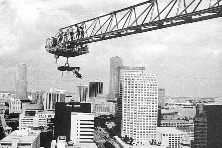 △摄制组被悬挂在一个临时的摄像平台上,该平台连接着迈阿密市中心上空的起重机臂。