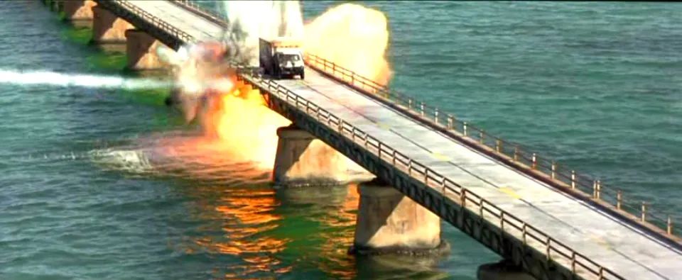 如果说有哪场戏最能体现《真实的谎言》在实体特效上的成就,那无疑是佛罗里达群岛的桥梁爆破戏。