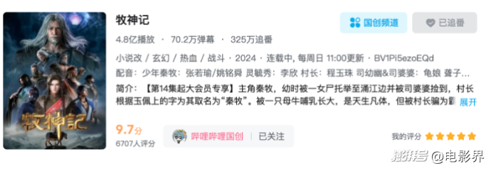 《牧神记》动画初登场就凭借其独有的“暗黑国风”美学概念、精致到配角都各具特色的建模质量、让观众印象深刻的角色群像塑造,取得哔哩哔哩站内播放量破5亿,登顶站内榜单TOP1超500+次,累计追番人数超300万,全网总曝光超70亿,高赞爆款内容1000余篇的佳绩,用开分9.7的高口碑成绩,印证了好故事和好制作的双向成就。