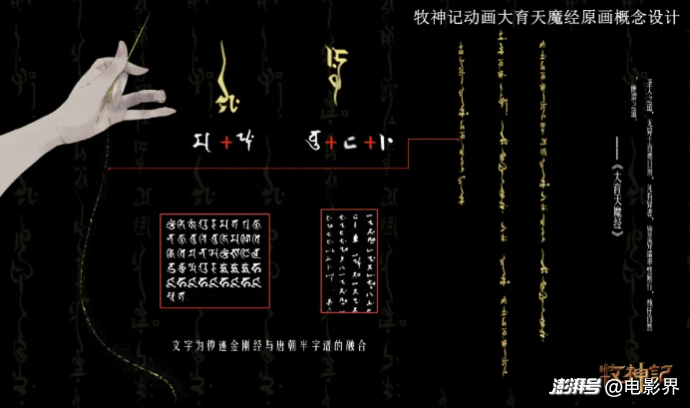 除了在文化传承方面的贡献,《牧神记》在画面呈现方面也用心良苦。幕后采访中,制作团队尝试在不背离原著小说的基础上,有思考的将现实民俗文化和传统东方元素与原有设定融合。如为残老村的高手完善 “风华绝代” 的造型,以此凸显肉体破损精神飞升的人设对比;吸收借鉴秽迹金刚经、燕乐半字谱、小篆及其他楔形文字的风格,对《牧神记》神魔等字体思路进行差异包装;而作为《牧神记》初篇的起点、主角团们生活的 “残老村” 也充分借鉴了新石器晚期的良渚文化,茅草与石土的质朴和诡谲奇异的大墟形成对照,最终不以风格化为目的的《牧神记》终于以其独有的“暗黑国风”和细致入微的刻画在品类繁多的3D国产动画赛道以真“黑”马的身份脱颖而出。