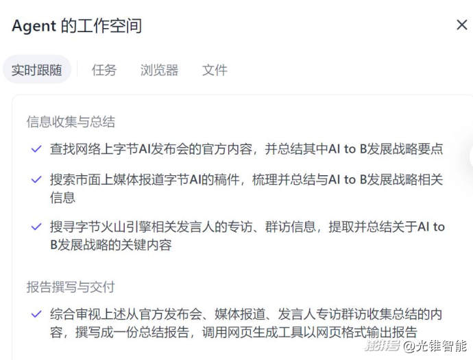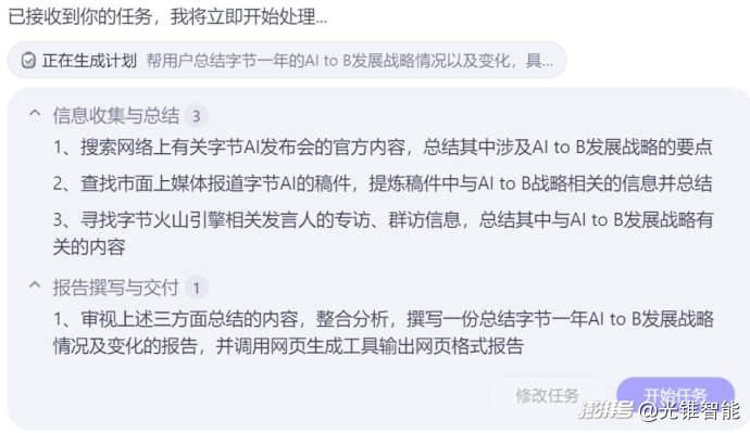 拿到体验码后,光锥智能以“字节一年To B的AI战略”为要求,让Agent帮忙收集信息并生成一份分析报告。Agent将任务拆解成4个步骤,并在测试者的意见修改下,给出最终的拆解结果:
