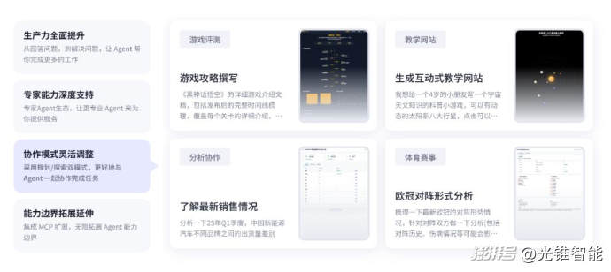 根据扣子官网给出的各种使用体验案例,扣子既可以用来写游戏攻略、市场调研报告,也能基于字节提供的数十种MCP实现更加复杂的需求,比如用高德地图MCP+Agent写一份旅游指南,用飞书多维表格统计数据等等。