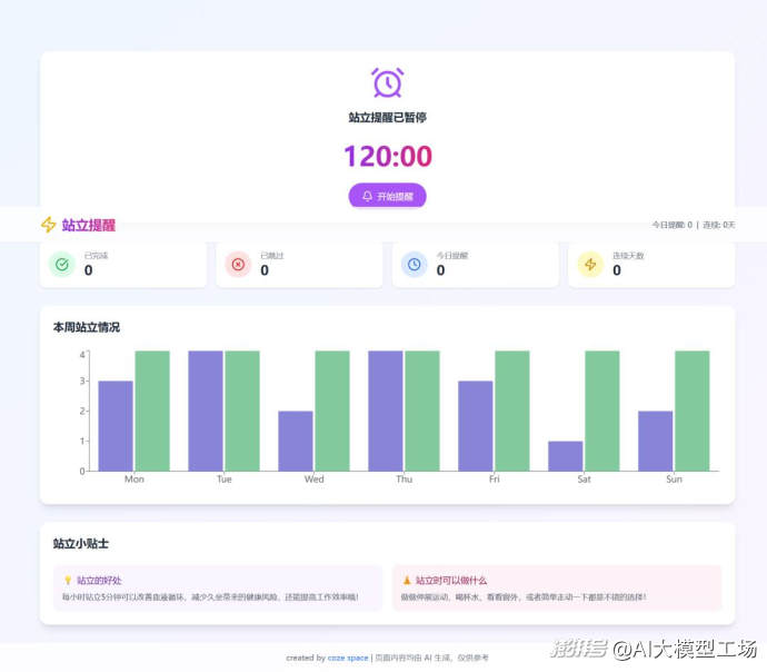 这段时间腰不太舒服,我试着让扣子用探索模式帮我生成一个倒计时两小时提醒我站立的时钟。