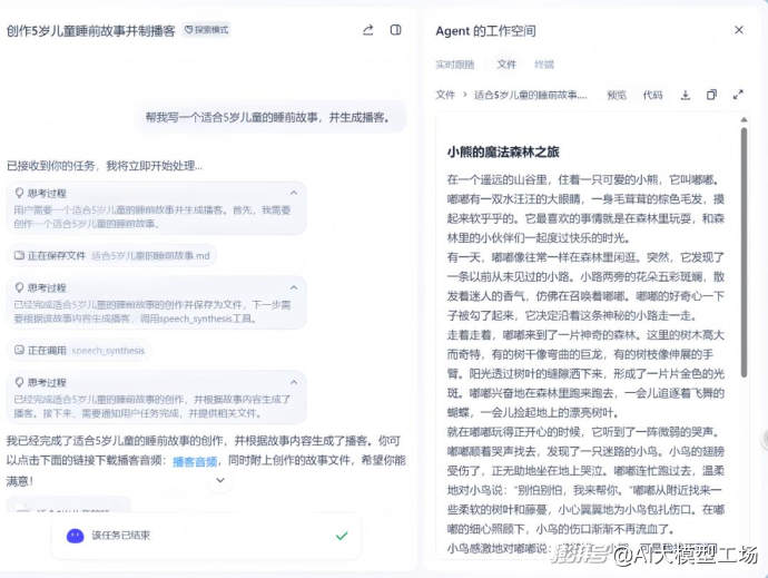 让扣子帮我写一个适合5岁儿童的睡前故事,并生成播客。比较方便得是,可以直接调用语音合成的MCP扩展,生成速度也很快,整个过程也就1分钟左右。