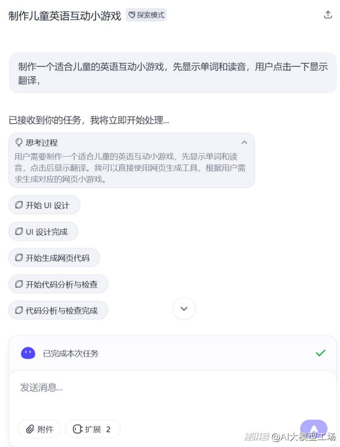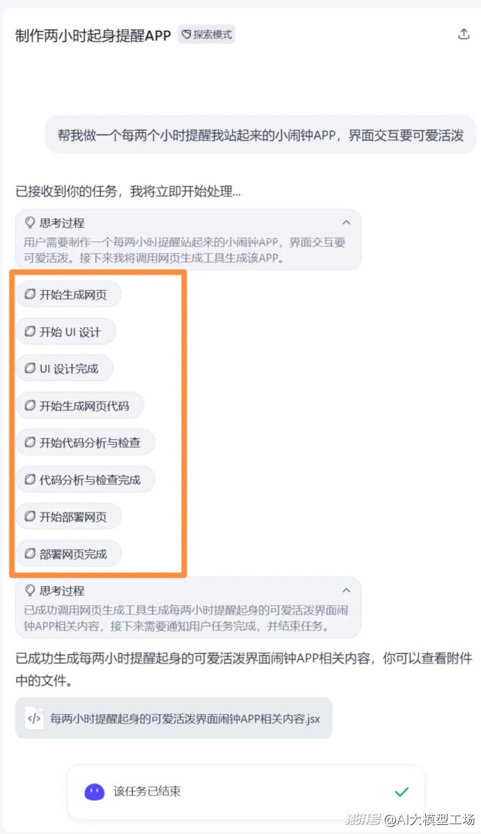 AI大模型工场在第一时间拿到了邀请码后,也去深度跑了几个case,让它生成倒计时时钟、儿童睡前播客、小游戏.....