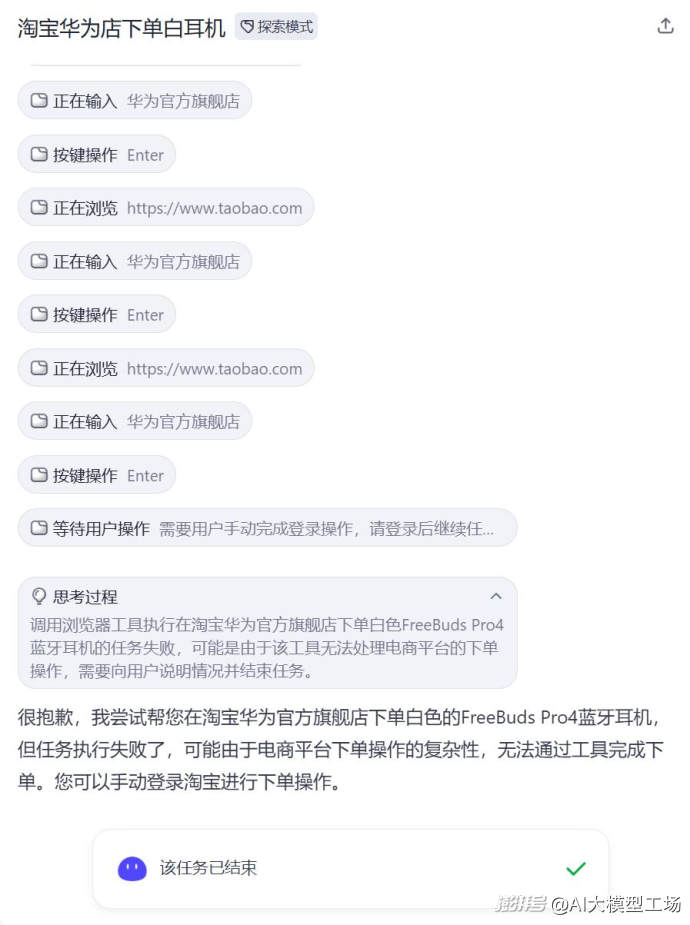 更进一步,给它下达去淘宝购买耳机的指令,在人接管登陆淘宝后,扣子有找到耳机的官方旗舰店,但是遗憾的是并没有完成后续任务。
