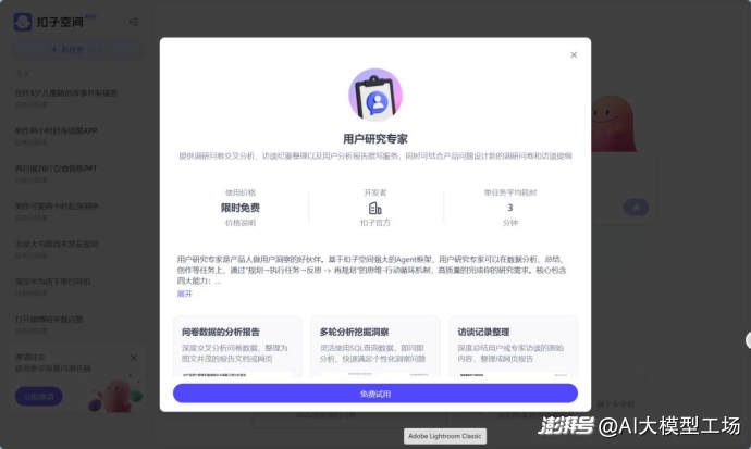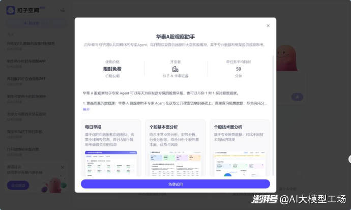 扣子除了能满足我们日常所需的各种场景需求外,还提供了专家级Agent服务,预设了「用户研究专家」和与华泰共创的「A 股观察助手」。