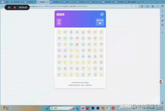 再尝试让扣子生成一个消消乐小游戏,第一次任务执行失败,不过第二次大概用了3分钟左右生成,这之后的“摸鱼搭子”小游戏不就分分钟拿捏。