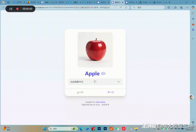 之后我用非常白话的语言,告诉扣子,做一个适合儿童学习英语的小游戏,尽管提示词没有要求要加图片,但扣子还是针对每个单词匹配了相应画面,读音和翻页翻译也完全符合要求。