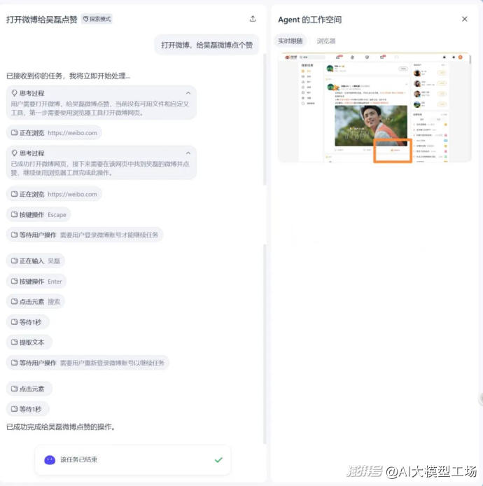 除了上面的操作外,我也尝试让扣子用规划模式去直接调用不同的平台去进行一些操作。比如让它打开微博,给吴磊的微博点个赞,整个过程很快也很丝滑,在打开微博的时候会让人去接管登陆一下账号,之后的就是全程AI操作了。