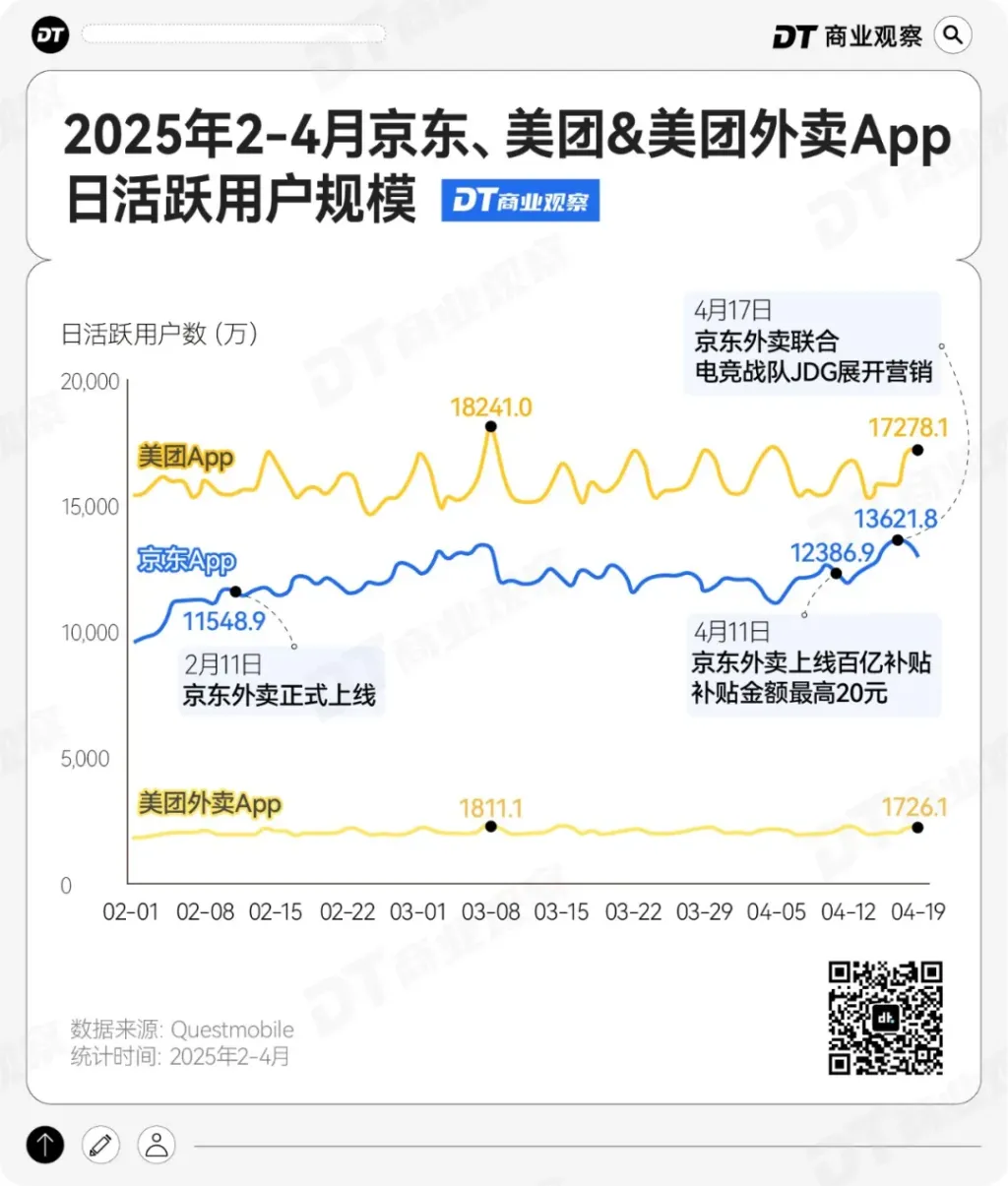 根据QuestMobile的数据,4月17日,京东App日活跃用户规模达到1.36亿,虽然整体较美团App1.7亿日活还有一定的差距,但距离外卖业务上线首日已经增长了2072.9万,增幅达到17.9%。