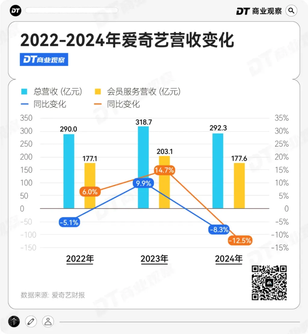 2024年,爱奇艺交出了一份不太理想的成绩单。财报显示,2024年爱奇艺的收入为292.3亿元,同比下降8.3%;其中第一大营收来源会员服务的收入为177.6亿元,同比下降12.5%。