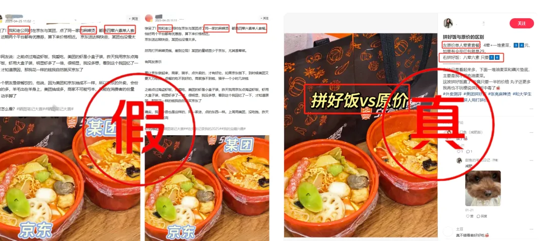 近日,社交平台开始出现多个在不同平台点同一家外卖,进行对比,恶意造谣的内容。美团发现,这类内容在语言风格、表达逻辑、造谣内容基本一致,甚至有多个账号套用同样的文案,如:甚至出现多个男性账号也用“我和老公”等字样,最终指向“美团外卖因抽佣高,导致在美团点餐,出现商家减量、降质”等。美团在此声明:相关内容系恶意造谣,所谓的“对比图片”早在今年1月份就开始批量出现,与实际情况严重不符。
