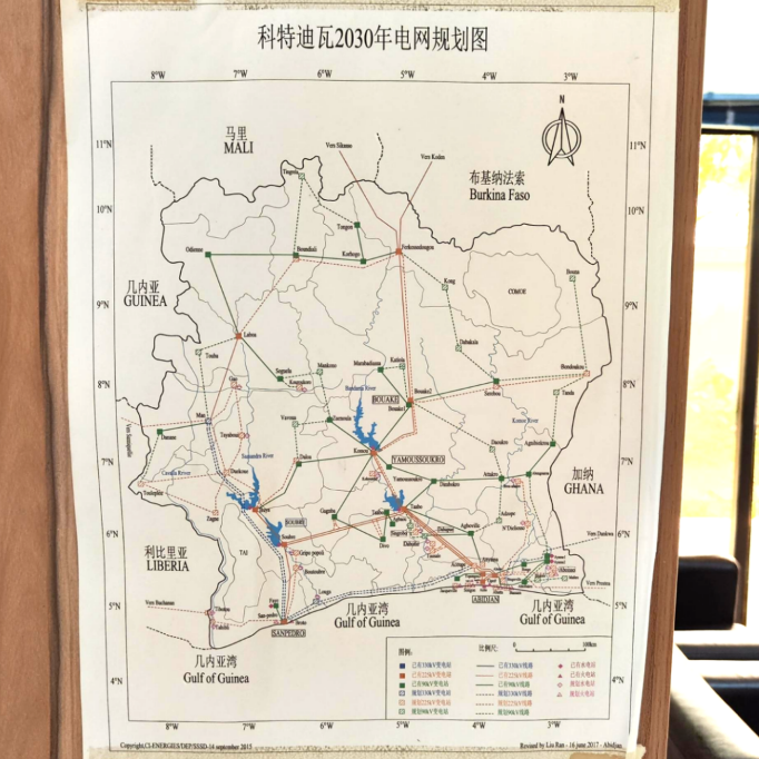 图4:科特迪瓦电网规划图(摄于中国电建中西非区域总部,文中水电站位于左下)。