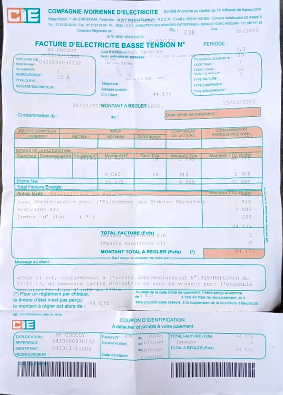 图5:科特迪瓦科科迪区电费账单(笔者住处实拍)。