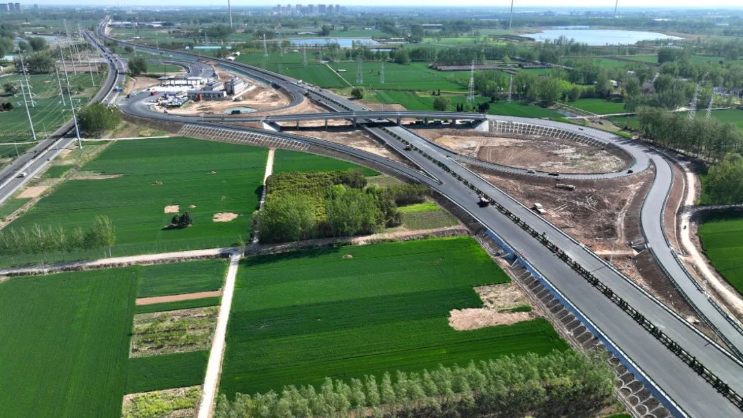 图中可见该处互通已基本建成,沥青已完成摊铺,画面正中向前延伸的为通往徐州方向
