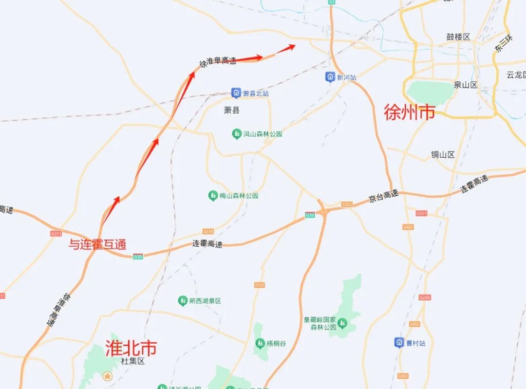 上图为过了该处互通,徐淮阜高速将向东北方向通往京台高速徐州处,即徐淮阜高速公路的起点,如下图所示