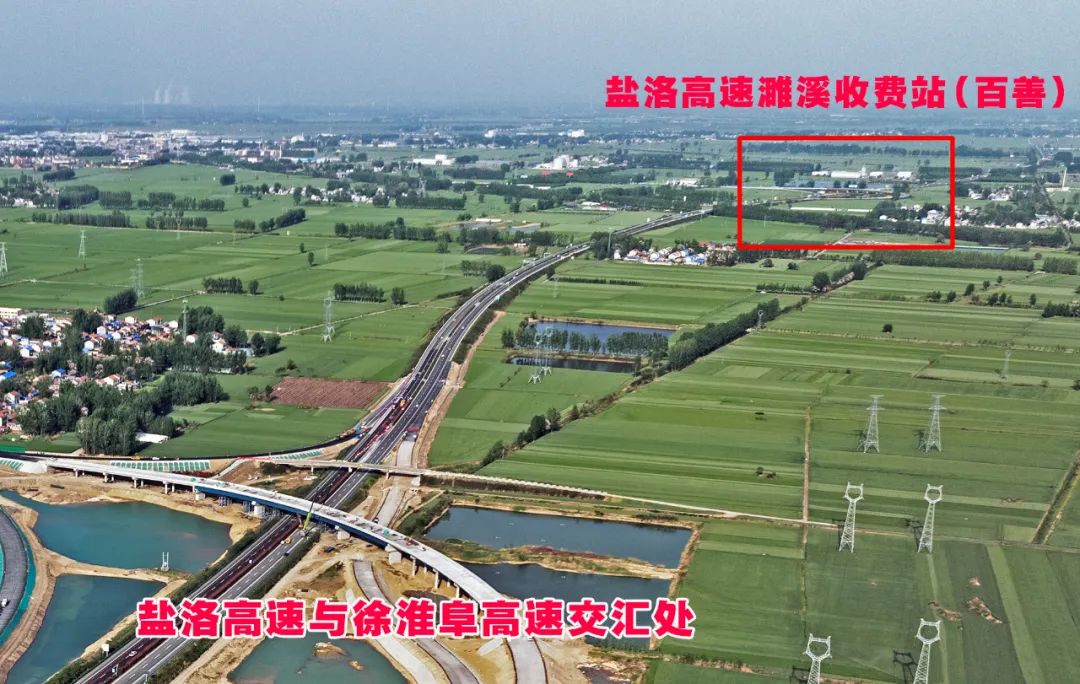 该交汇处向东不远,即是盐洛高速濉溪收费站,市民可在这里上下高速根据线路规划,徐淮阜高速公路