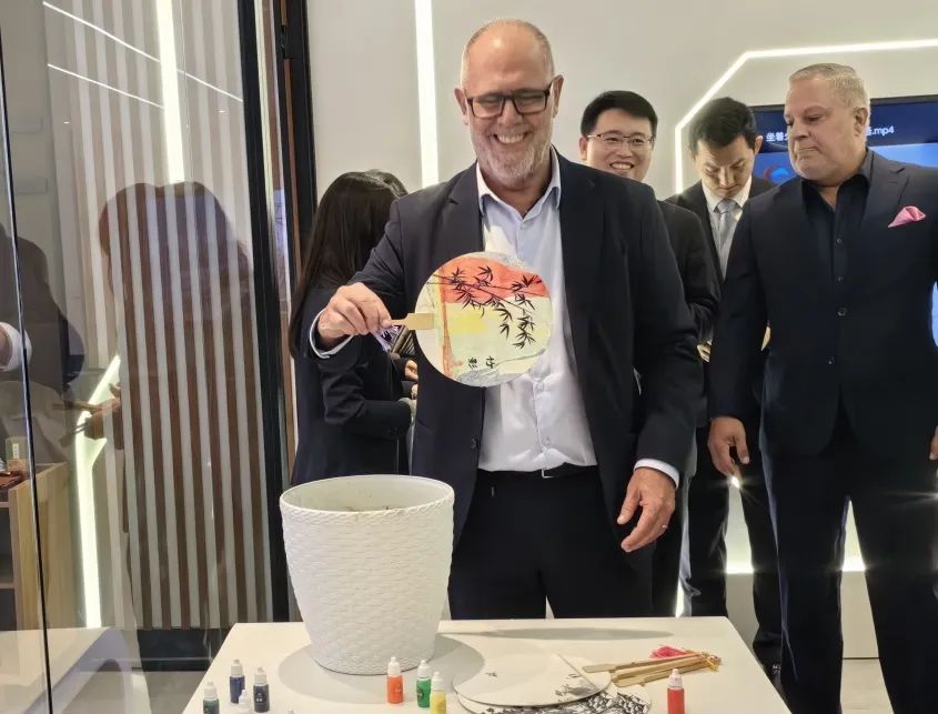 △左右滑动查看在参观环节,与会嘉宾欣赏了《匠心》等中车高铁工匠的工艺作品,观看了“坐着火车看世界”宣传片,体验了中国非遗文化漆扇以及中国茶艺、巴西咖啡文化等,深刻体验了中巴文化的交融。